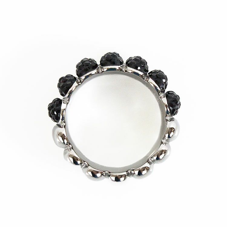 小さなビジューをパヴェ状に敷き詰めたハーフエタニティボリュームリング。キラキラと手元を輝かせる大ぶりで華やかなリングは、存在感抜群。ゴージャスなゴールド(クリア)、大人カッコいいシルバー(ブラック)リングが、いつものコーディネートを格上げしてくれます。