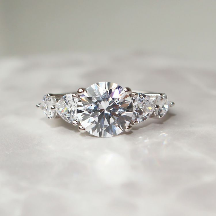 ジュエリーに用いられるダイヤモンドと同様の精巧なカットを実現した、特別なキュービックジルコニアを使用したリング。そのカット技術により、光を最大限に反射し、曇りのない美しく眩い輝きを放ちます。センターストーンの横にハート型のキュービックジルコニアを配したボリューム感があり華やかなデザインです。