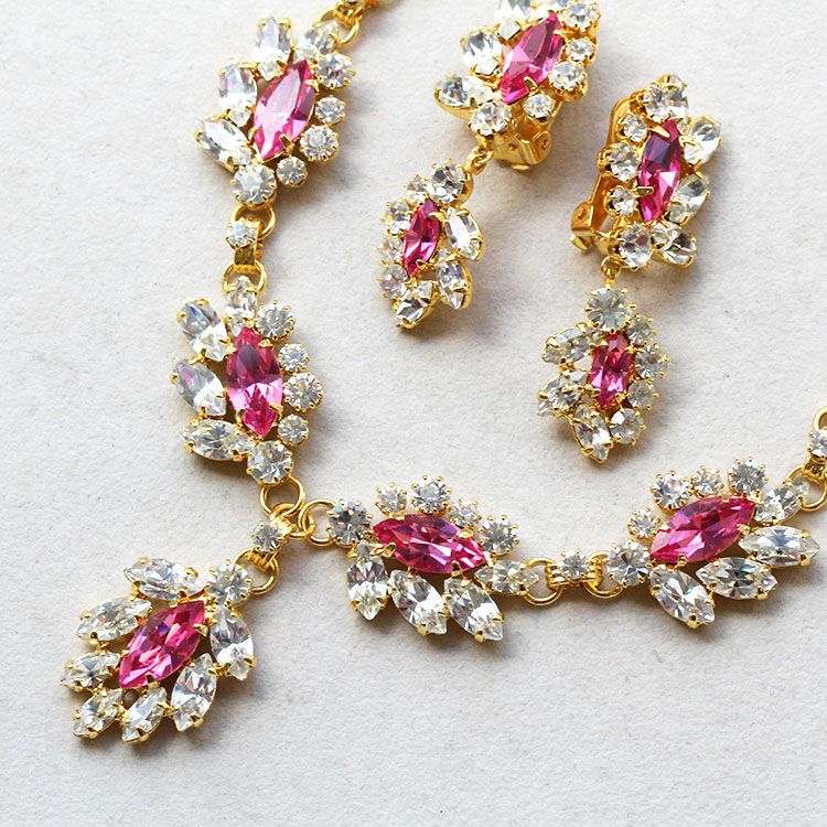 フラワーモチーフのビジューが華やかなショートネックレスとイヤリングのセット。キラキラと煌めくビジューが特別感を演出しています。パーティー、ブライダルジュエリーはもちろん、発表会や演奏会、舞台用のアクセサリーにもご利用いただけるネックレス・イヤリングセットです。