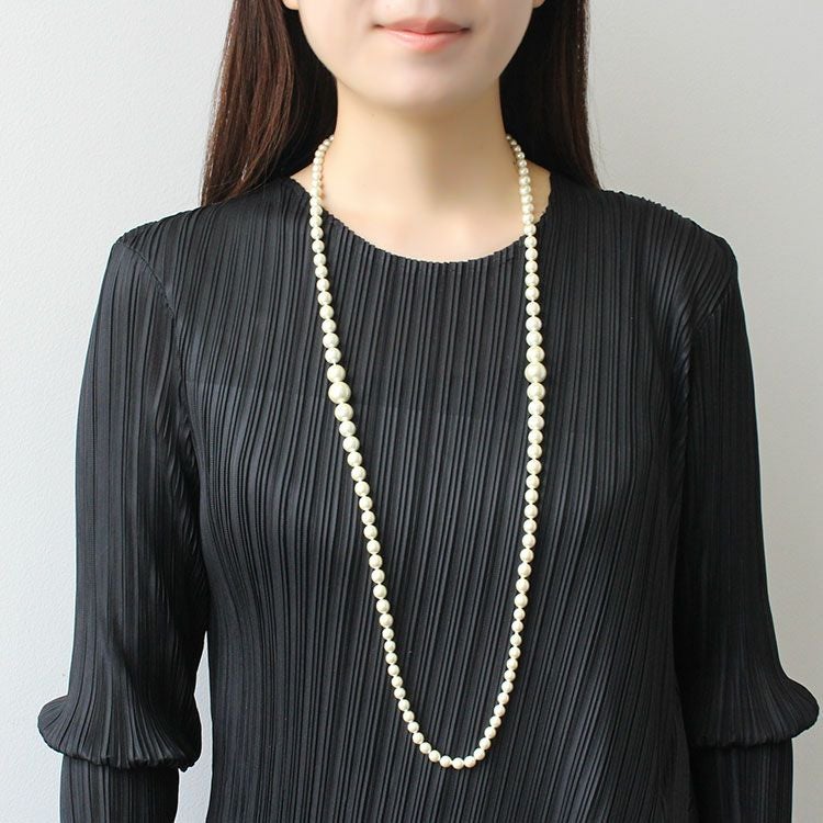 イタリア製ビンテージプラスチックパールを使用したロングネックレス。大小パールのバランスが洗練されたデザインです。軽いのでロングパールネックレスでも負担がありません。