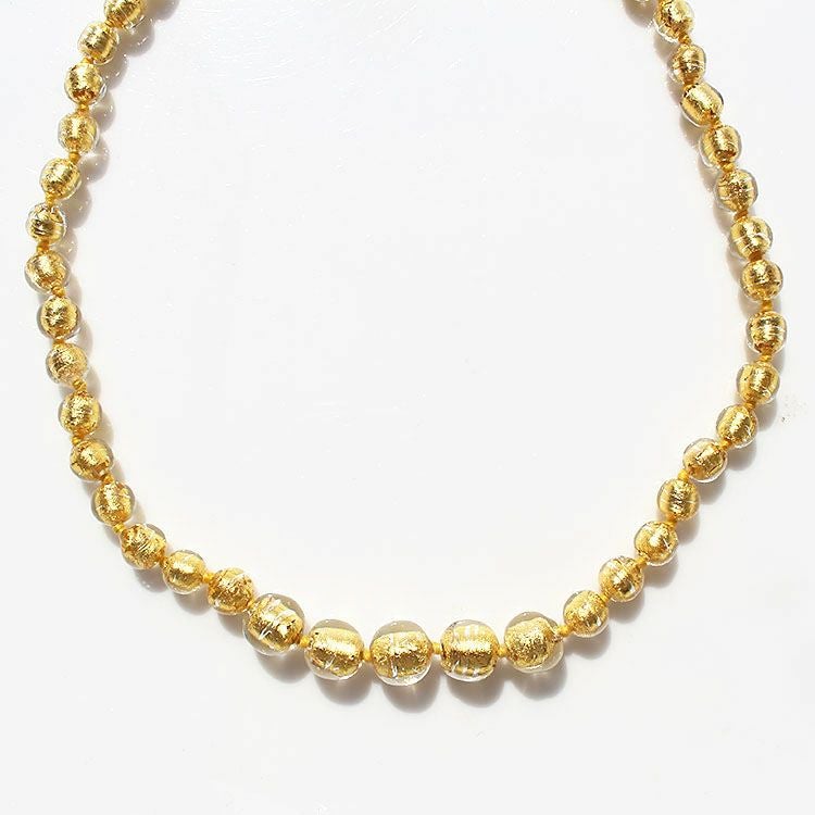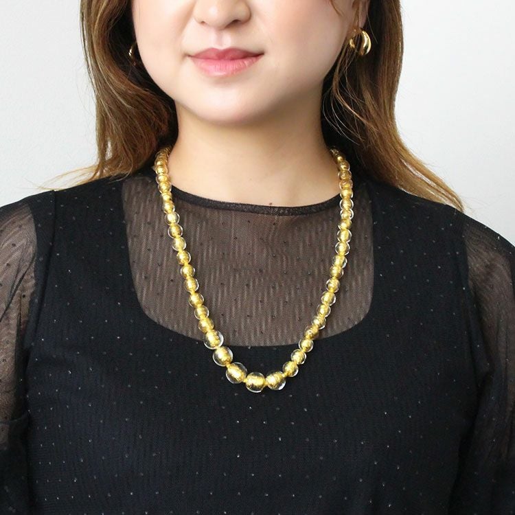 瑞々しいクリアのガラスに包まれた金箔が美しく煌めき、様々な表情をみせてくれるロングネックレス。シンプルなデザインでも、優しさや温かみ、柔らかさを感じさせるのは、他のヨーロッパクリスタルやガラス製品とは異なる、ベネチアンガラスならではの不思議な魅力です。