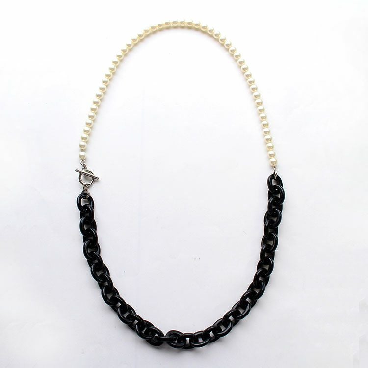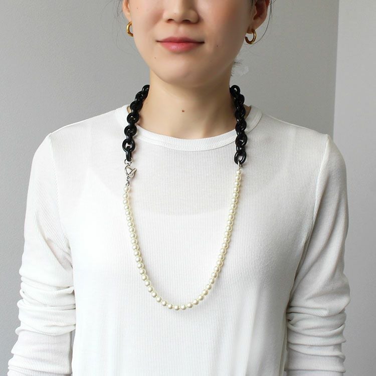 イタリア製のロングネックレス。アクリルチェーンとパールのコンビネーションがおしゃれなデザインです。太目のチェーンも軽いので付けやすくなっています。パールを上、チェーンを下にしたり、その反対など、使い方も様々。お好みのスタイルでご利用ください。