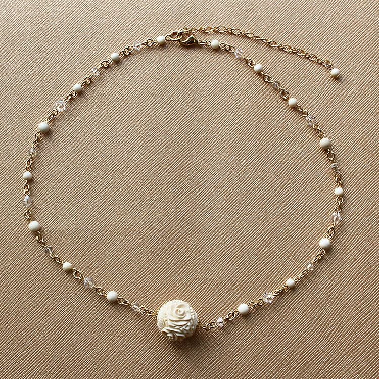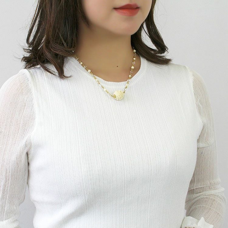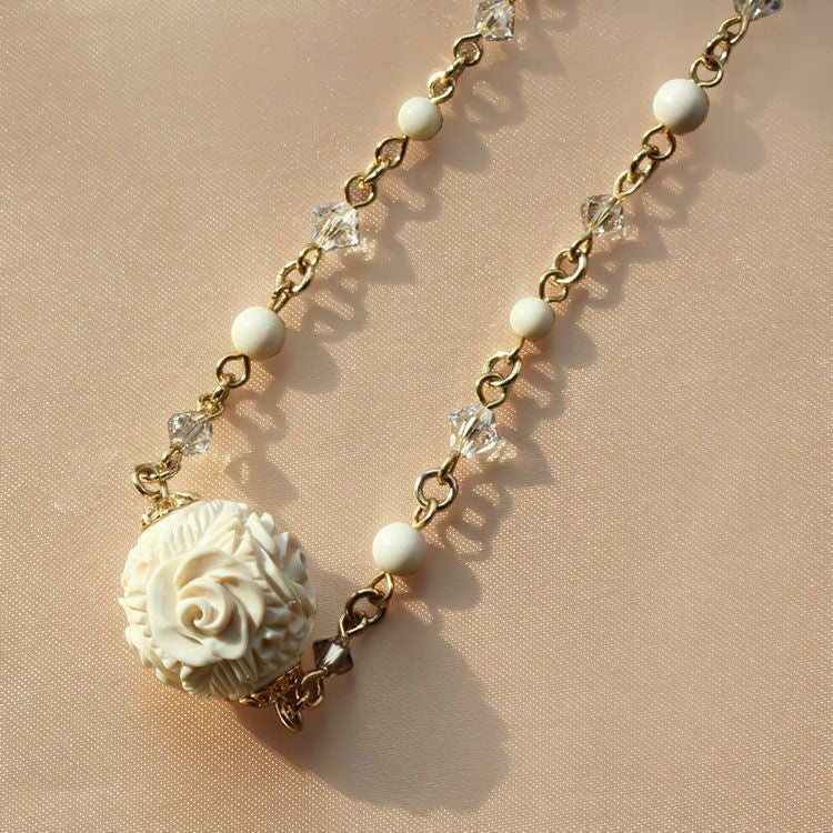 約3万年前の氷河期に生息していたマンモスの牙を使用し、ボール状に加工したパーツにローズモチーフを彫り込んだショートネックレス。職人の技術力の高さが伺えるひと品です。チェーン部分には、細かいマンモスビーズとマンモスが生きた氷河期をイメージして、クリスタルガラスのビーズをあしらいました。