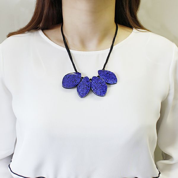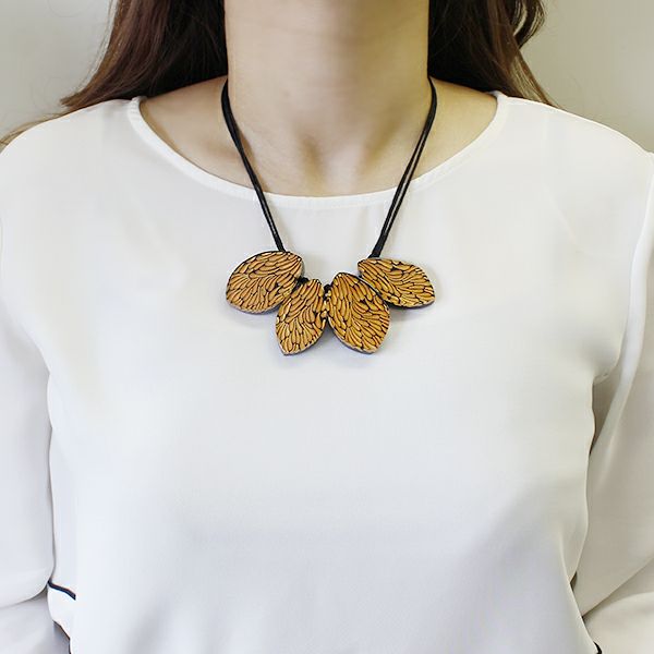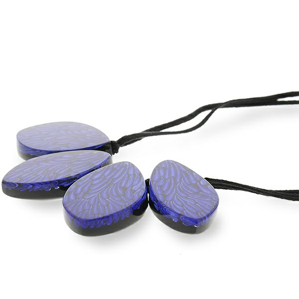 土台に動きのある羽模様を彫刻、色付けした上に、クリアのポリエステルレジンを流した、透明感と高級感を出したネックレス。鮮やかなカラーとブラックのコントラストが存在感を引き立たせます。