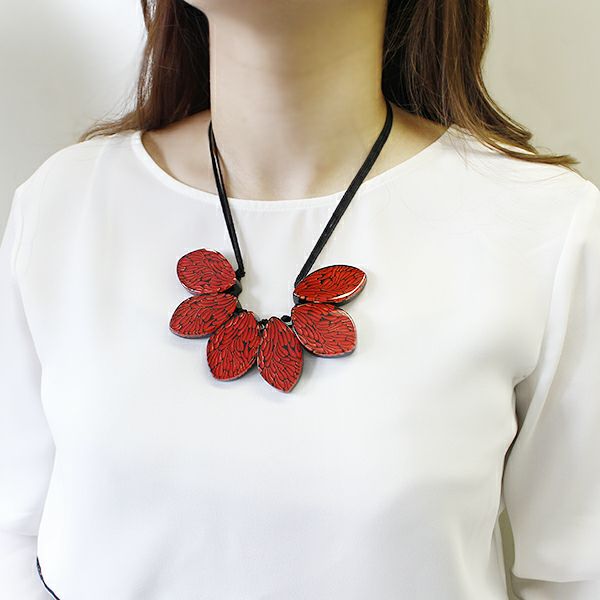 土台に動きのある羽模様を彫刻、色付けした上に、クリアのポリエステルレジンを流した、透明感と高級感を出したネックレス。鮮やかなカラーとブラックのコントラストが存在感を引き立たせます。