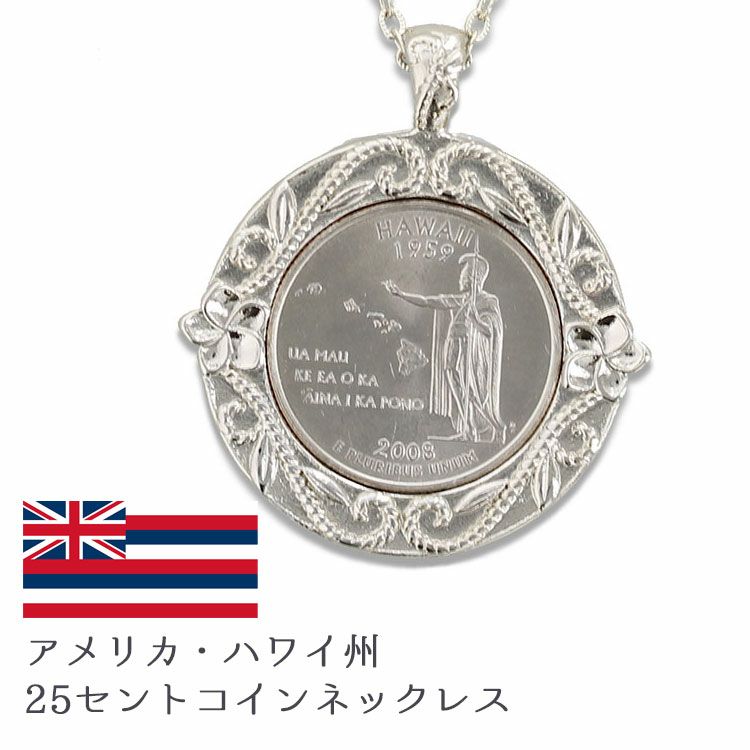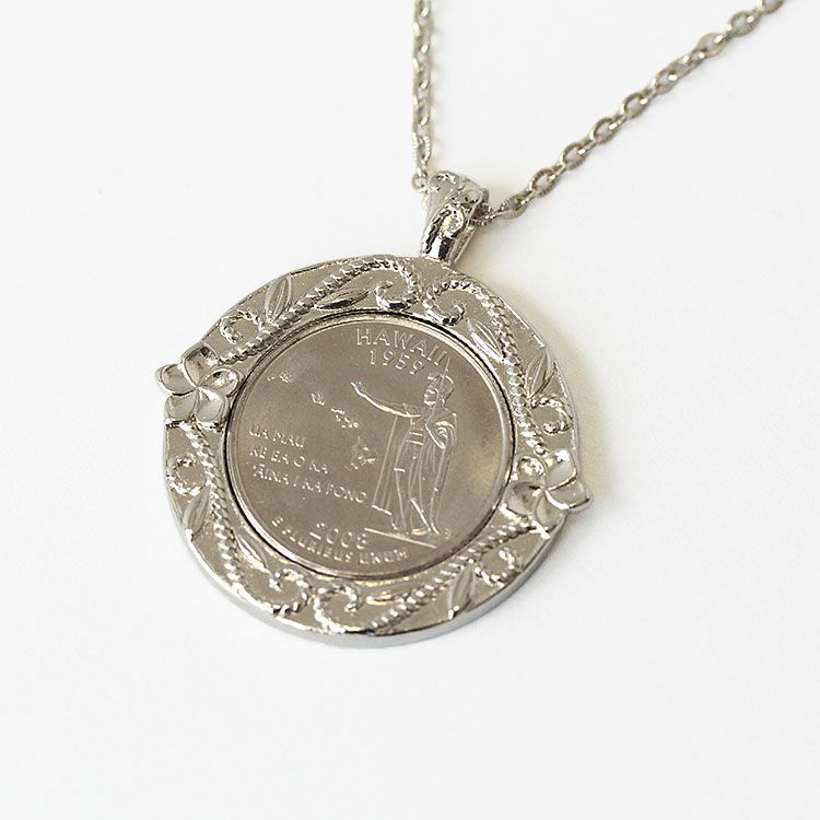 アメリカハワイ州の25セントコインを使用したネックレス。コイン周りにプルメリアのお花をあしらい、ハワイらしく仕上げました。 本物のコインをアクセサリーとして加工したものなので、コインの年号は異なります。