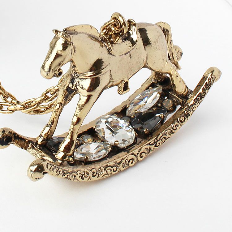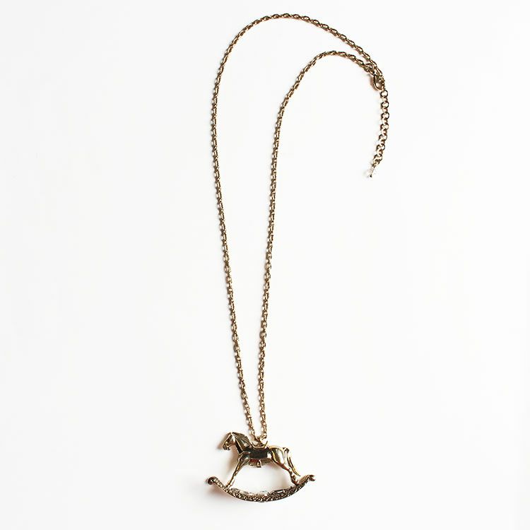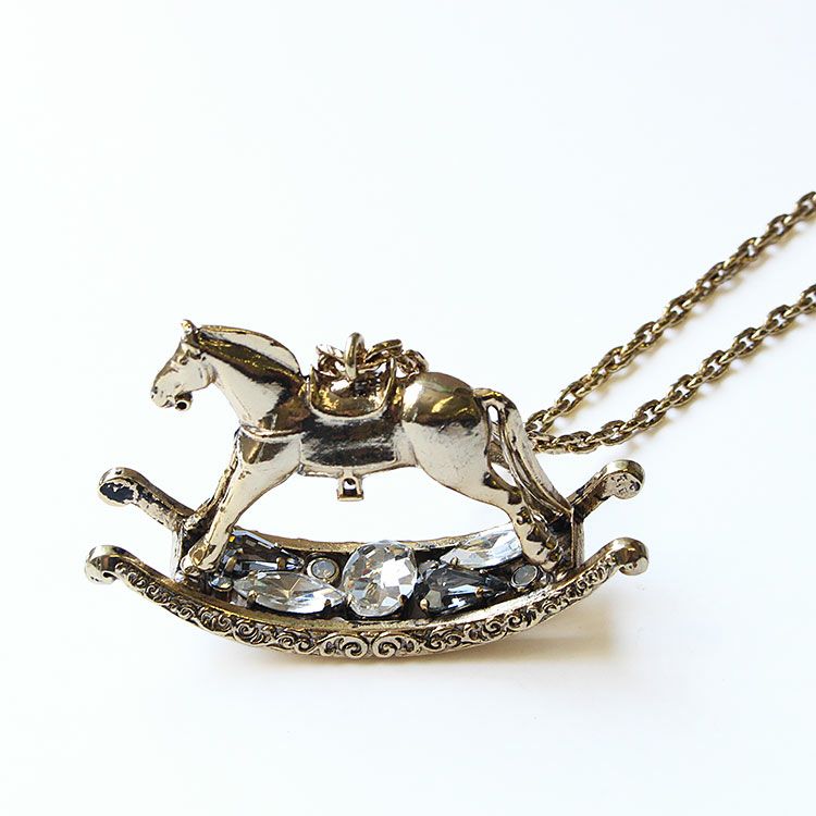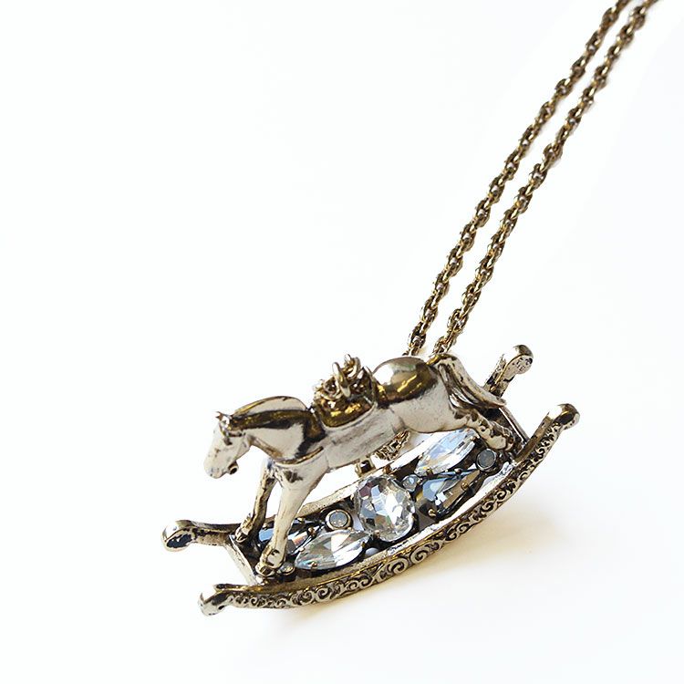 アンティーク風な趣が魅力のロッキングホースモチーフロングネックレス。チェーンには表面加工が施されていて高級感を醸し出しています。弓形のフレームからなるロッキング部分には、大きめなビジューが配置され煌めきを放っています。やや重めのモチーフでも納得のおしゃれなデザインです。