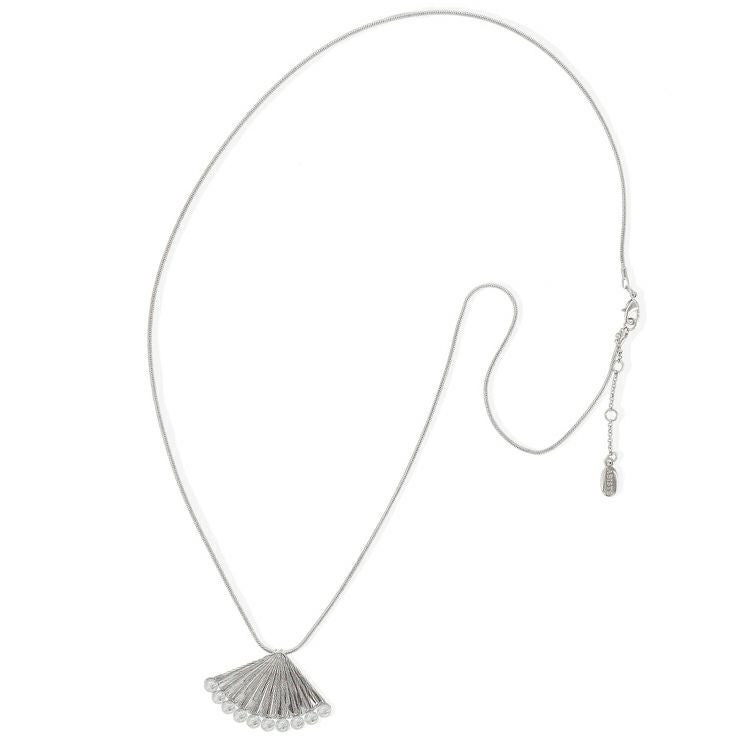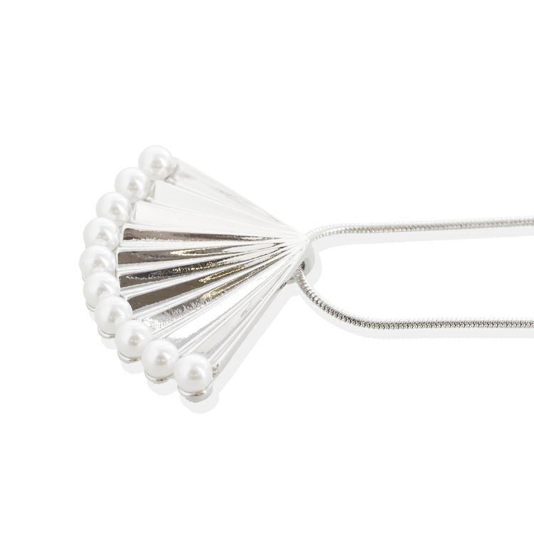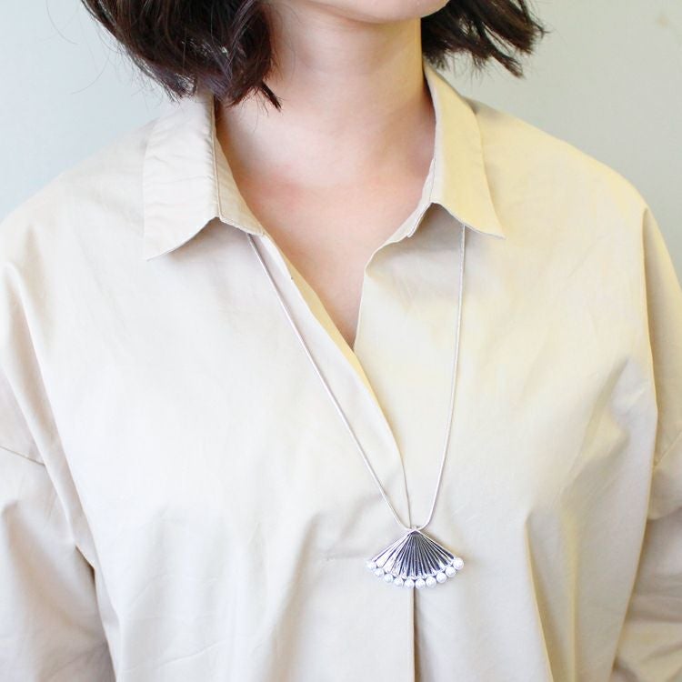 扇状のメタルパーツにパールをあしらったロングネックレス。普段使いはもちろん、お出かけやパーティでも映えるデザインです。
