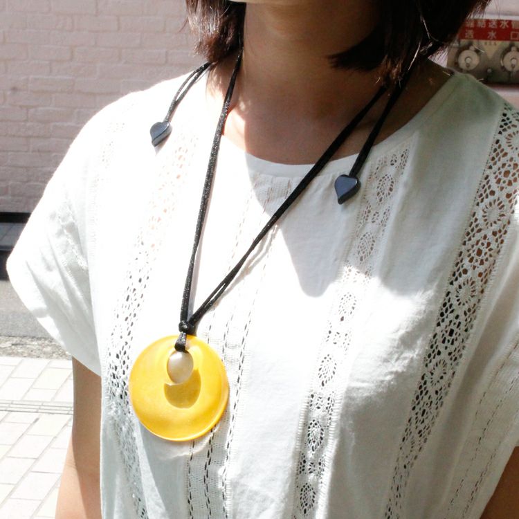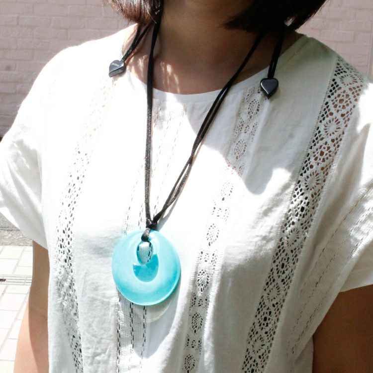 透明感のあるアクリルで作られたネックレスは、存在感もありながら透き通ったクリア色が軽やかなイメージに。ガラスよりも透明度の高いアクリル素材は、ガラスほど重くもなく身に着けやすいので、扱いやすくオススメの素材です。