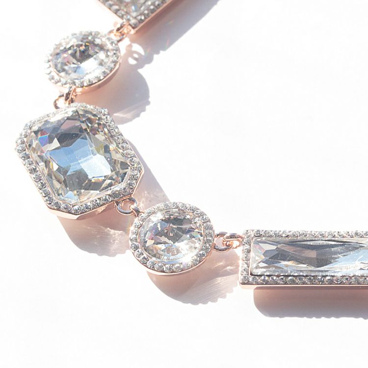 チェコストーンをふんだんにあしらったエレガンスなデザイン。 ピンクゴールドにクリスタルガラスが眩しいほどに輝くファビュラスなネックレスです。