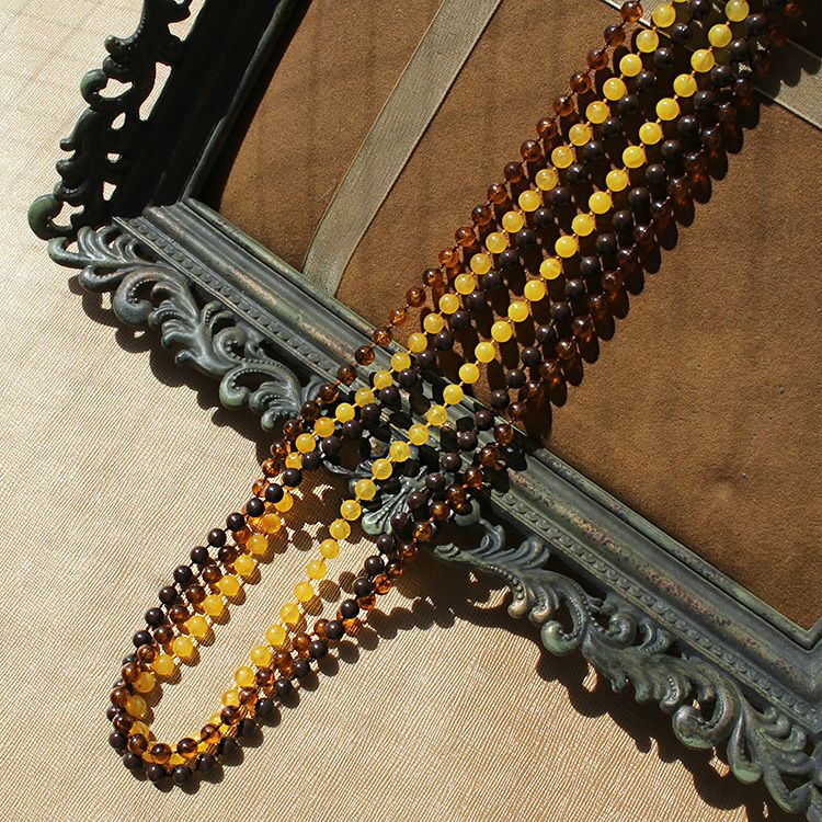 ブラウン、キャメル、イエロー3色のビンテージビーズを組み合わせた3連のネックレス。コーディネートに合わせるだけで秋らしさをUPさせること間違いなし。エレガントにもカジュアルにも最適です。