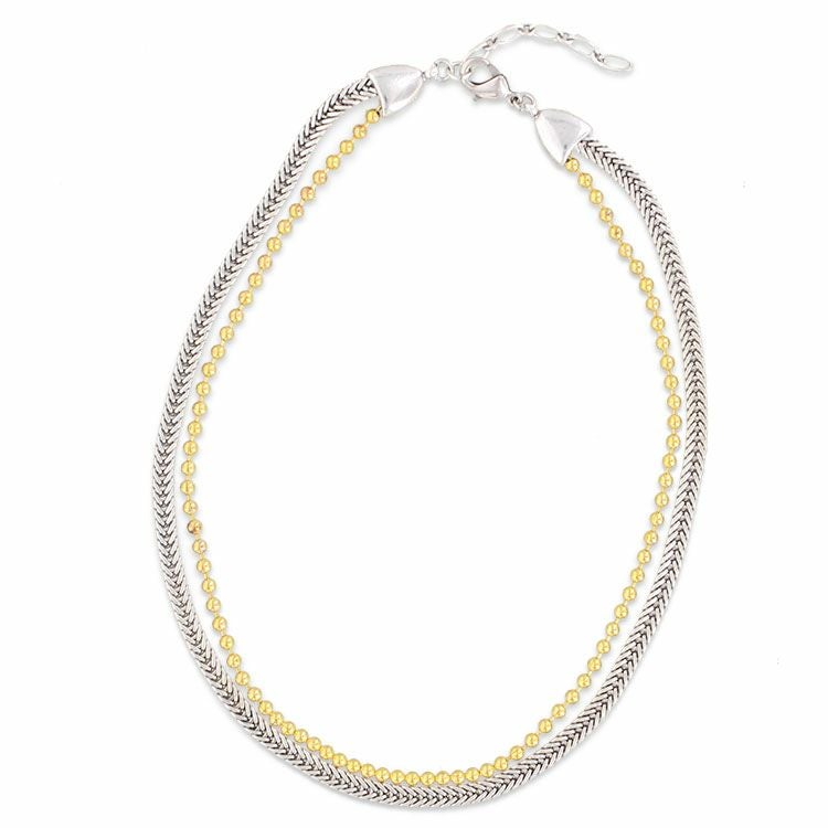 シルバーとゴールドの2種類のチェーンを重ね付けしたような2連ネックレス。