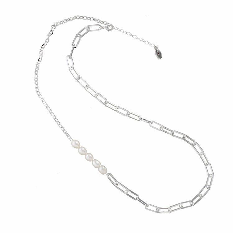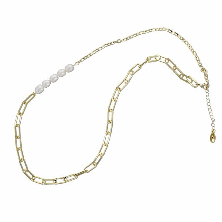 淡水パールをアクセントに配したメタルチェーンネックレス。使いやすい長さのネックレスはアジャスターを含めると最大75cmに調整可能。エレガントにもカジュアルにもお楽しみいただけます。