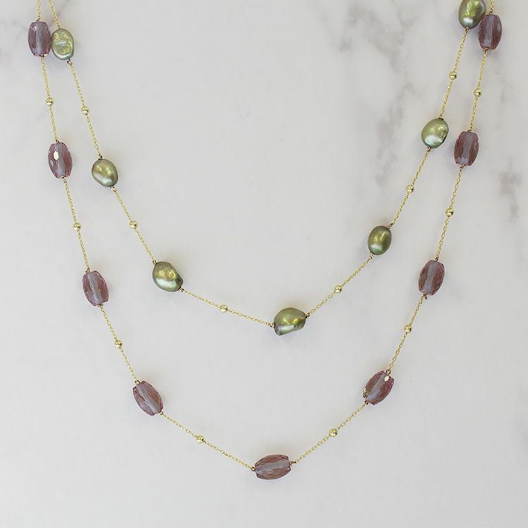 SV925+ゴールドカラーメッキ(チェーン)、淡水パール、人工ズルタナイト