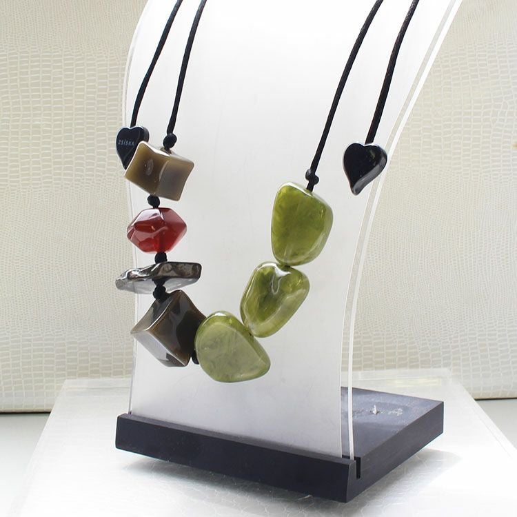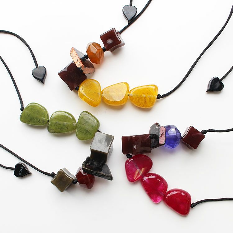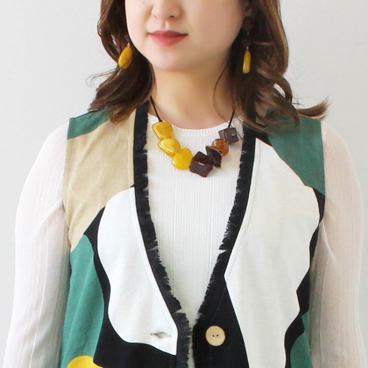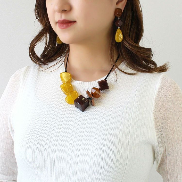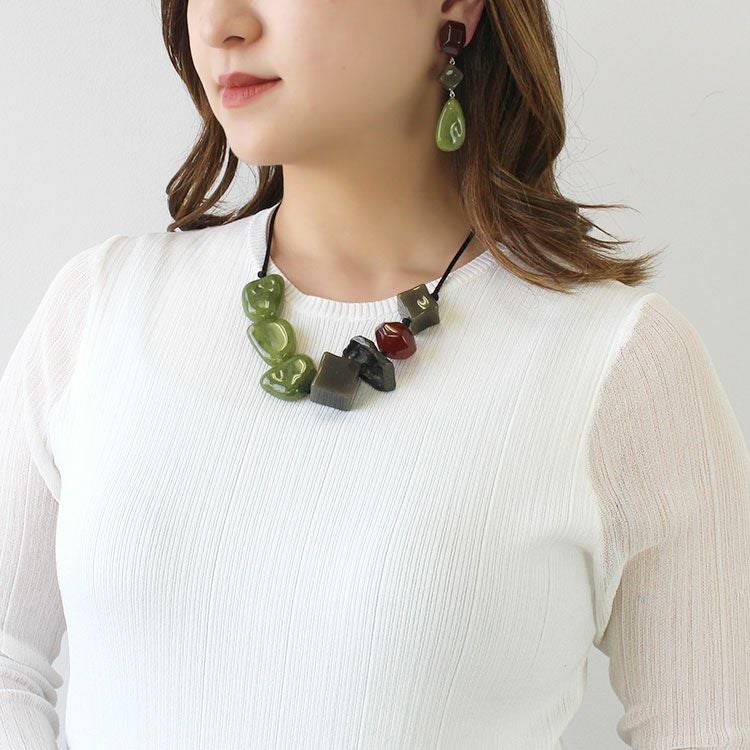 上質な樹脂、ポリエステルレジンの特性を活かし、ガラスのような質感を再現しつつも、軽くてつけやすいことで人気を博しています。肌に触れる部分に金属を使用していないため、アレルギーの方でも安心してお使いいただけます。