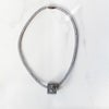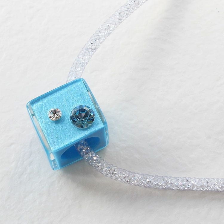 陰影のある印象的なカラーを艶やかなクリアレジンで包み込み、カラーの異なる大粒のクリスタルガラスを両面に配したトップパーツのネックレス。