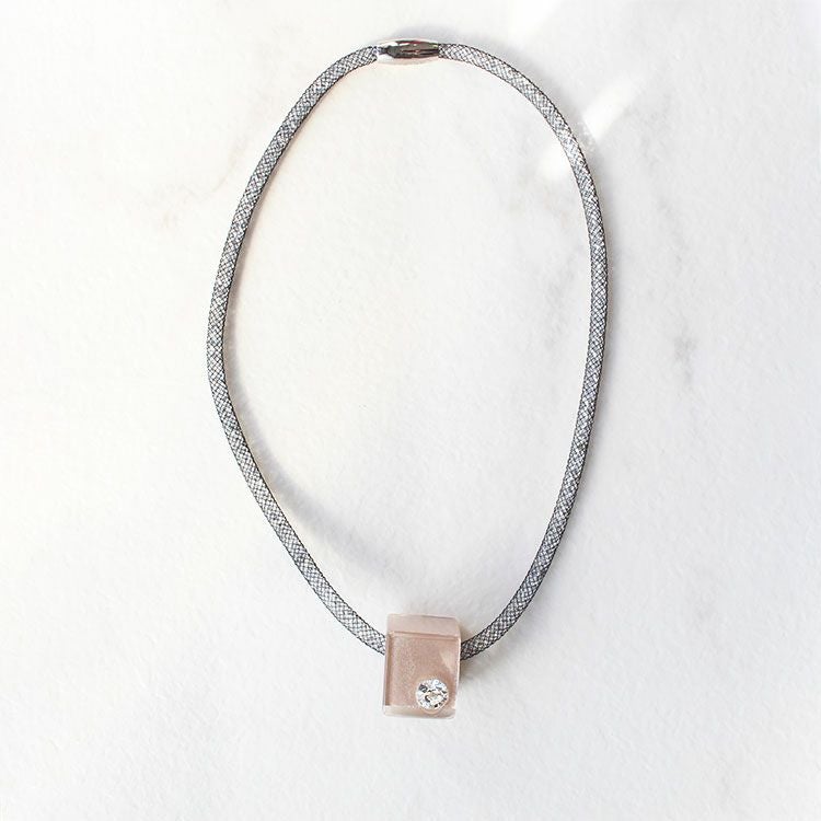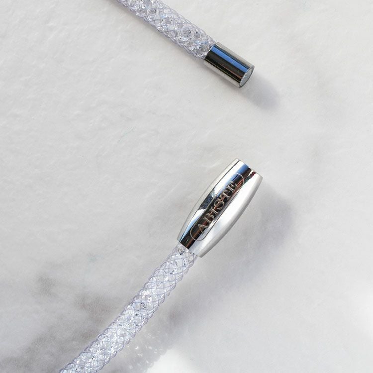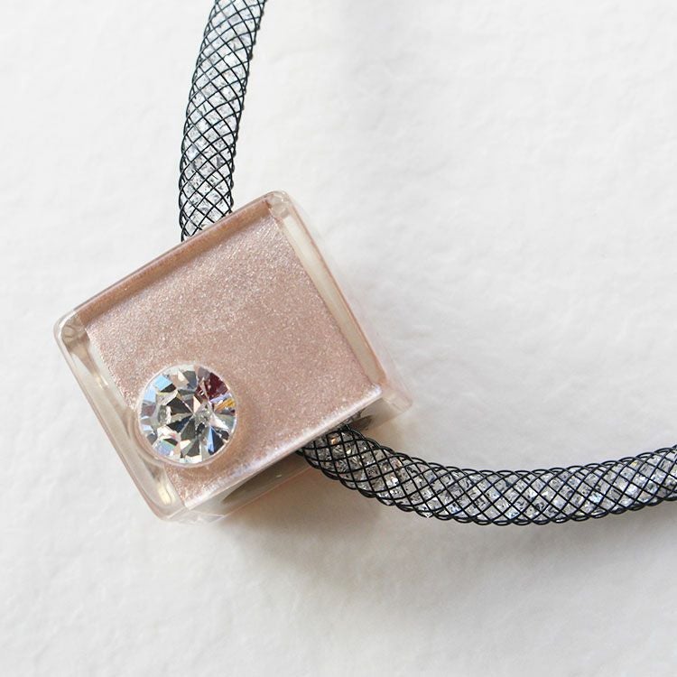 キラキラと輝きを放つ、カットガラスで満たされたメッシュコードは付け心地軽やか。マグネットクラスプで着脱も簡単です。