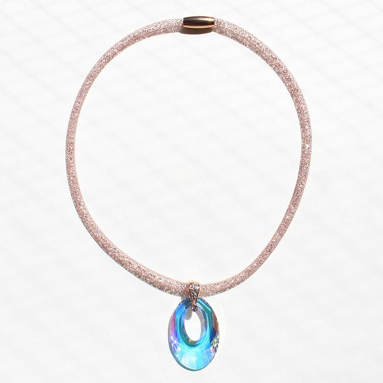 クリスタルガラスの穴あきドロップモチーフが印象的なショートネックレス。キラキラと輝きを放つ、カットガラスで満たされたメッシュコードは付け心地軽やか。マグネットクラスプで着脱も簡単です。