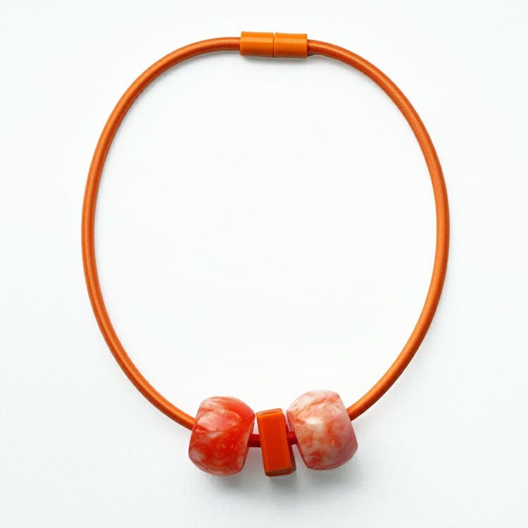 上質な樹脂、ポリエステルレジンの特性を活かし、ガラスのような質感を再現しつつも、軽くてつけやすいことで人気を博しています。肌に触れる部分に金属を使用していないため、アレルギーの方でも安心してお使いいただけます。