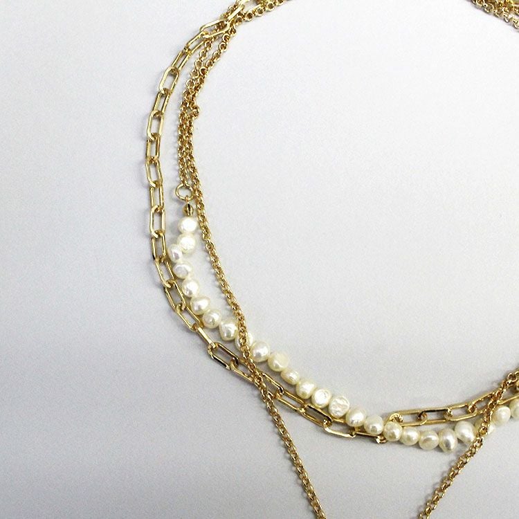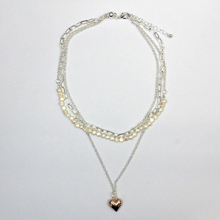 チェーンとチェン―ンと淡水パールのコンビ、ハートのペンダントからなる3連のショートネックレス。