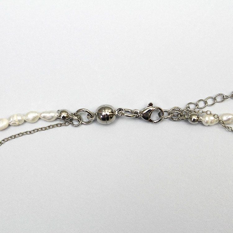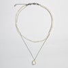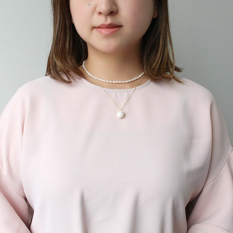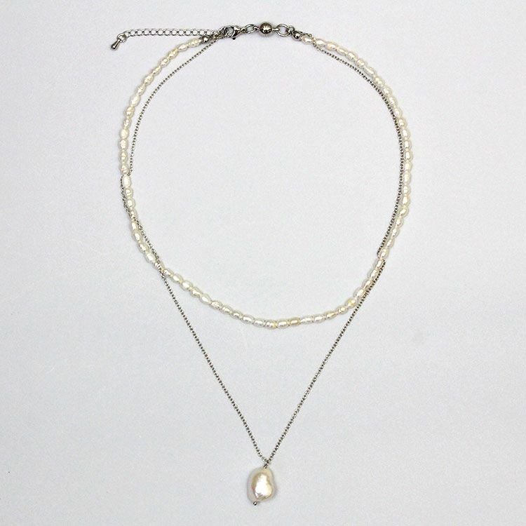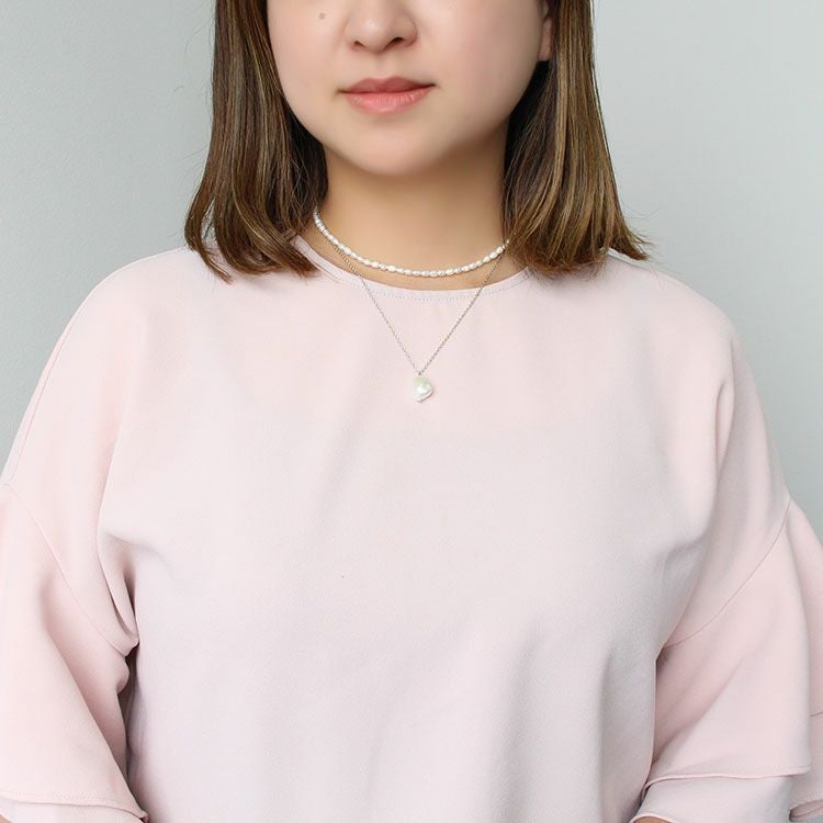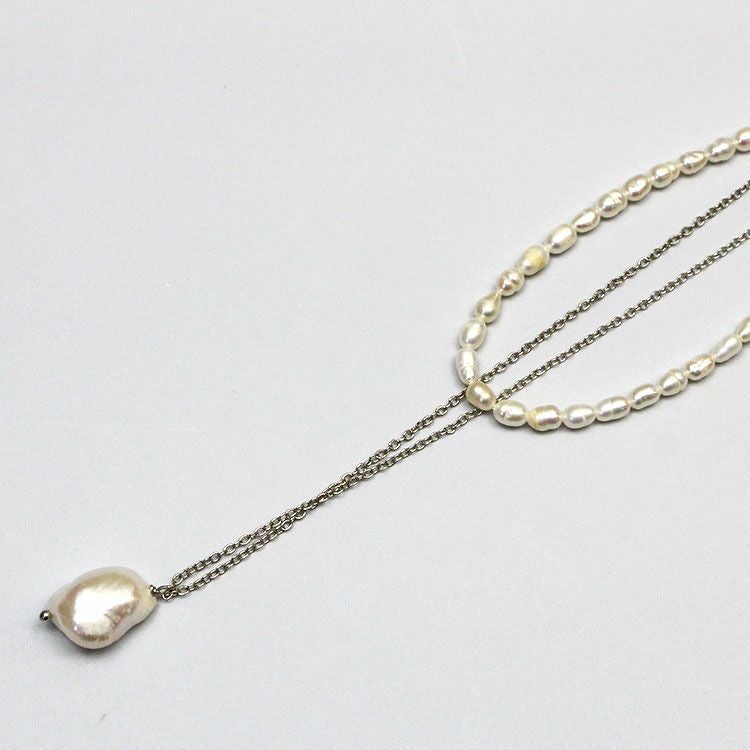華奢なチェーンに大ぶりの淡水パールのペンダントトップと一粒ずつ表情の違う淡水パールを組み合わせたネックレスが2連になったショートネックレス。