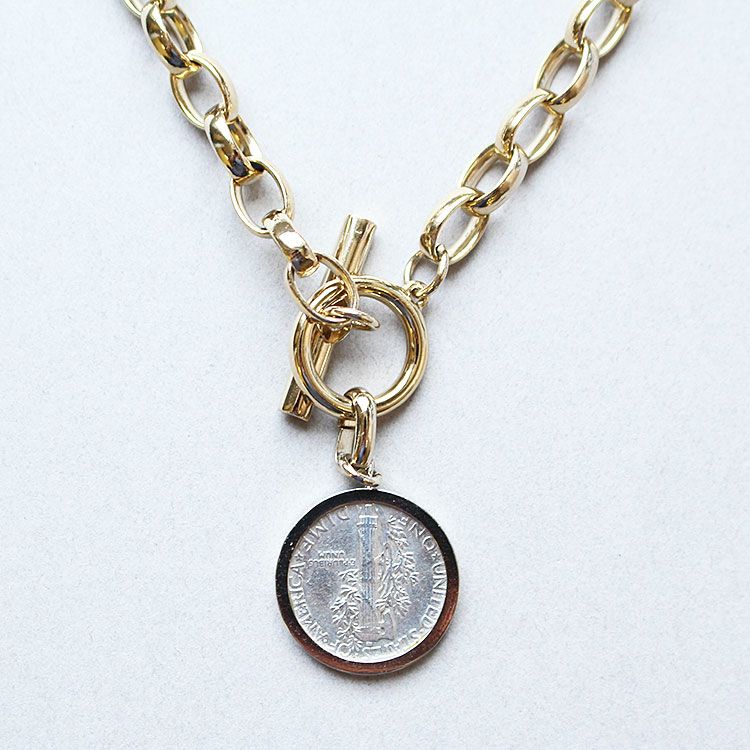 アメリカ10セントマーキュリーダイムコインと淡水パールの両方が一度に楽しめるロングネックレス。留め具のマンテルがアクセントになったオシャレなデザインは、幅広いシーンにご利用いただけます。
