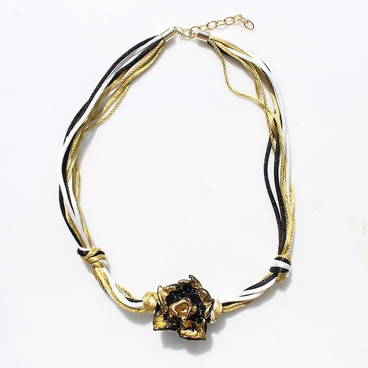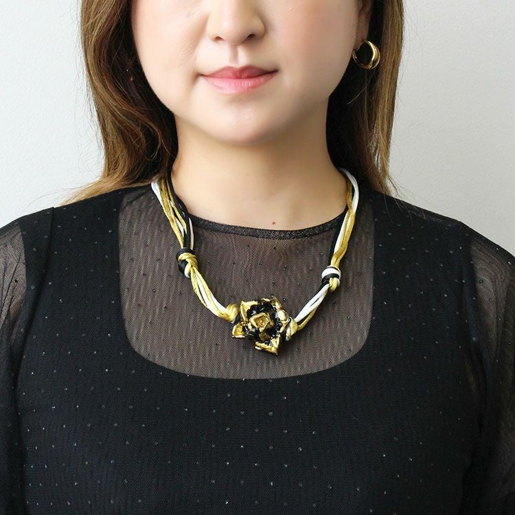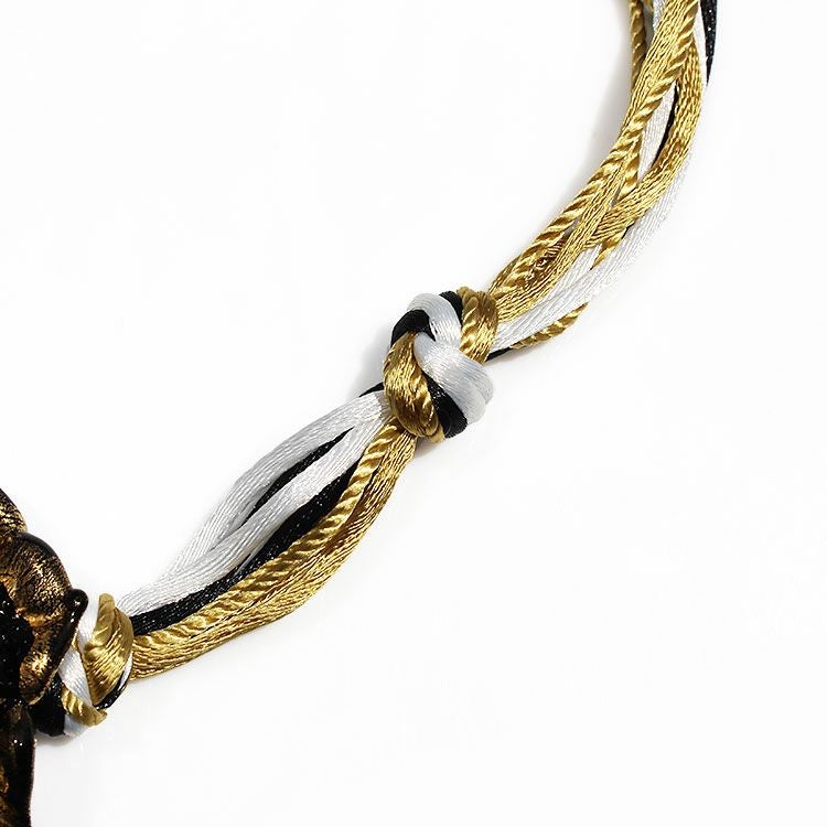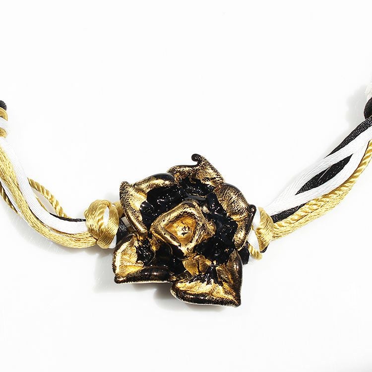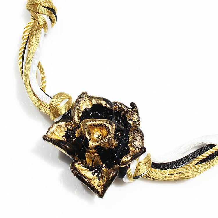 「オロロット(壊れた金箔)」の名のとおり、金箔が美しくクラッシュ模様を描くムラーノ島の伝統技法を用いて作られたローズモチーフパーツをシックなカラーのコードに通したネックレス。ノスタルジックなムードなのにどこか新鮮な、世代を超えて長く愛されるベネチアンガラスの魅力が感じられるネックレスです。