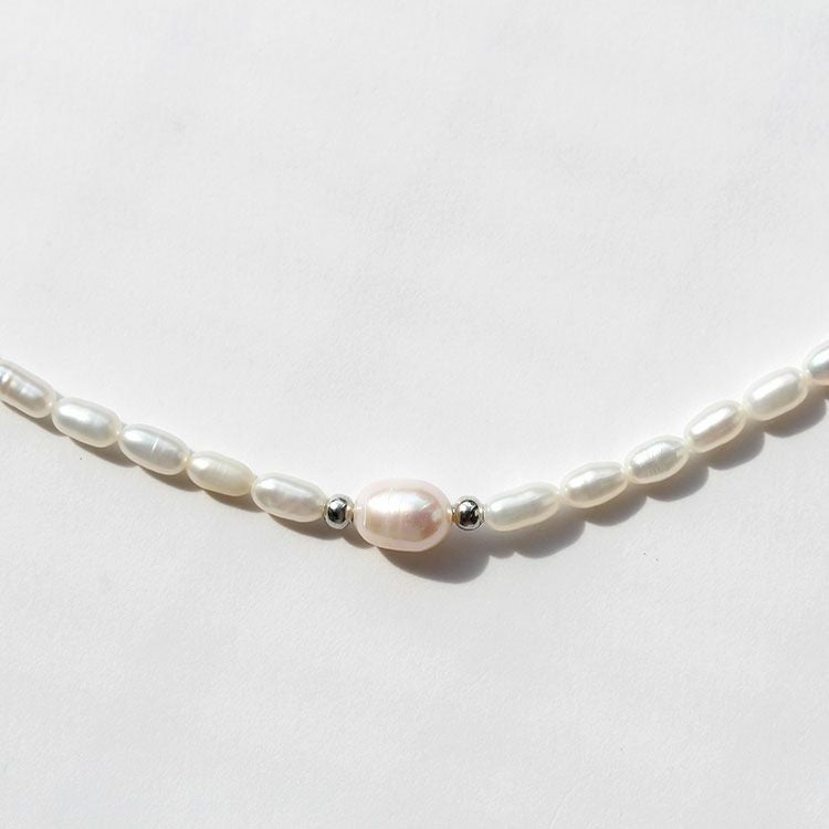 艶やかなライス型パールを連ねた淡水パールネックレス。優しく柔らかいホワイトの輝きがデコルテを美しく上品に見せてくれます。小さめパールは、チェーンやペンダント、太さの異なるパールのネックレスとの重ね着けもおすすめ。たちまちこなれた印象にしてくれます。カジュアルからフォーマルまでさまざまなシーンでお使いいただけます。