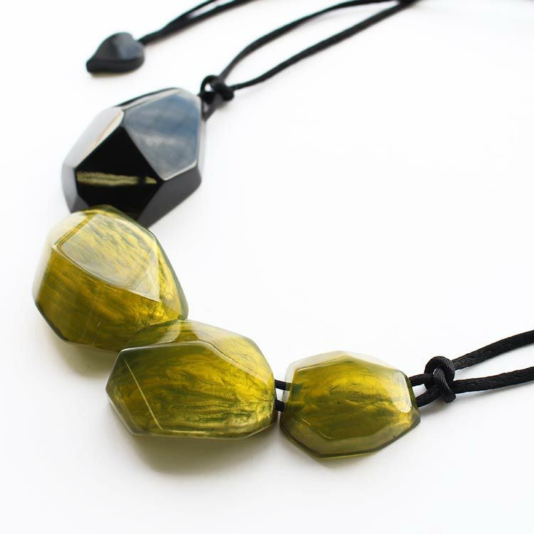 上質な樹脂、ポリエステルレジンの特性を活かし、ガラスのような質感を再現しつつも、軽くてつけやすいことで人気を博しています。肌に触れる部分に金属を使用していないため、アレルギーの方でも安心してお使いいただけます。