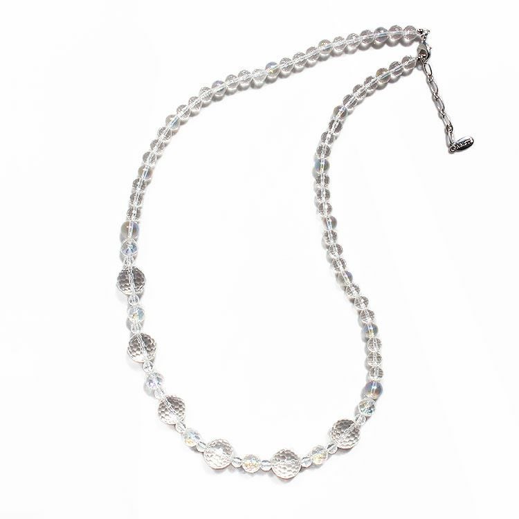 クォーツの中でも無色透明で純度の高い天然クォーツを使用したロック・クリスタル(本水晶)と、表面に虹彩被膜処理を行ったクォーツを組み合わせたロングネックレス。胸元でキラキラと輝き清楚感を漂わせています。