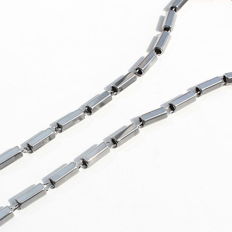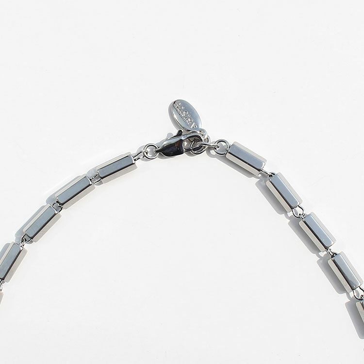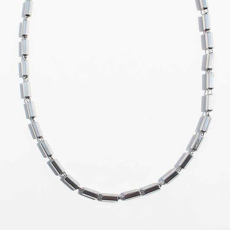 六角柱のメタルビーズを繋げたロングネックレス。洗練されたスタイリッシュなデザインは、女子会やお買い物はもちろん、オフィス使いやオケージョンシーン、パーティーシーンなど様々なシーンで活躍してくれるはず。