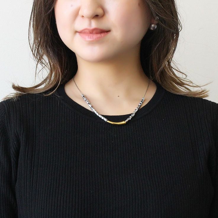 メタルビーズの中央に配置されたメタルバーがおしゃれなショートネックレス。洗練されたスタイリッシュなデザインは、女子会やお買い物はもちろん、オフィス使いやオケージョンシーン、パーティーシーンにもおすすめです。
