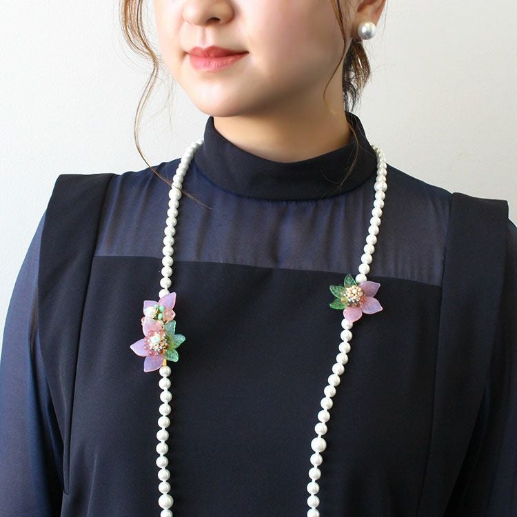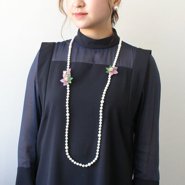 絶妙な色合いのフラワーモチーフに美しい光沢が魅力のガラスパールを合わせたロングネックレス。一連はもちろん、2連にして、フラワーモチーフを少しずらしてつけるなど、使い方で全く違うデザインのような表情に。パーティーや会食はもちろん、カジュアルなど幅広いシーンでご利用いただけます。