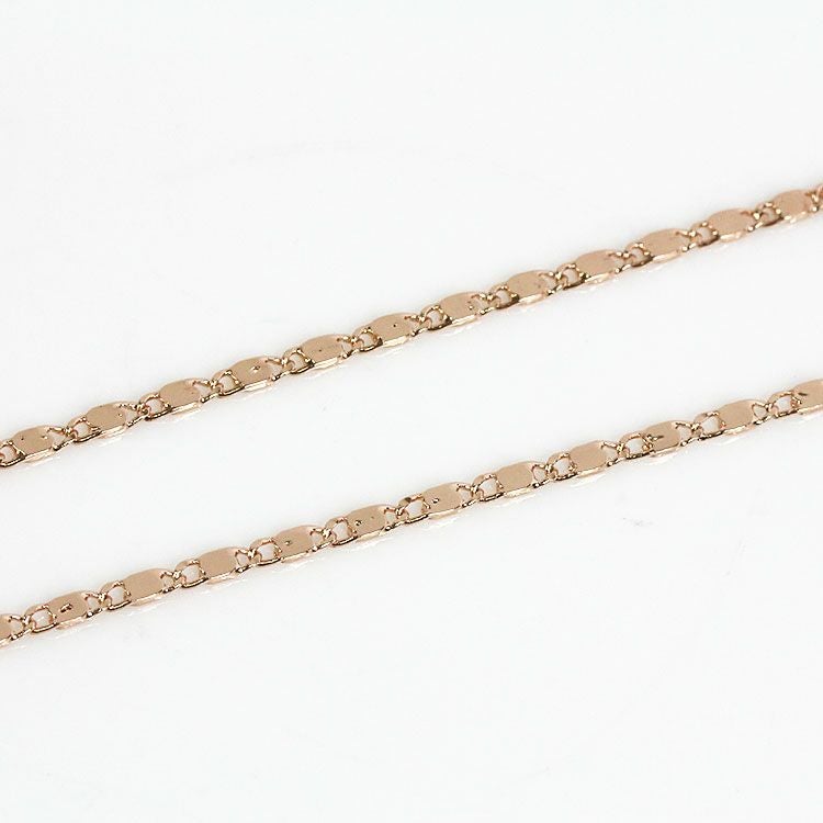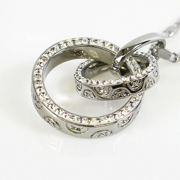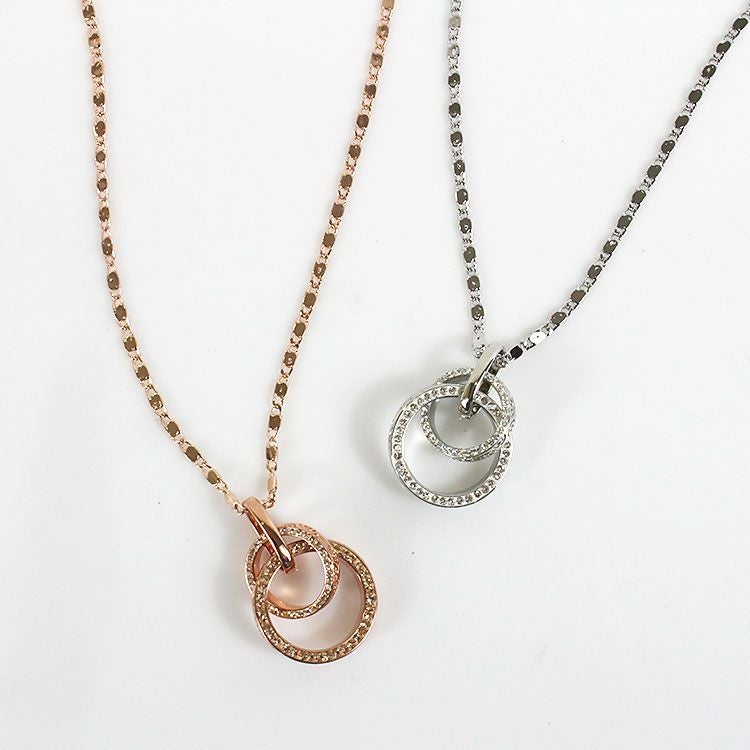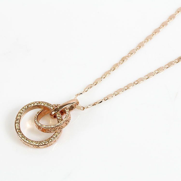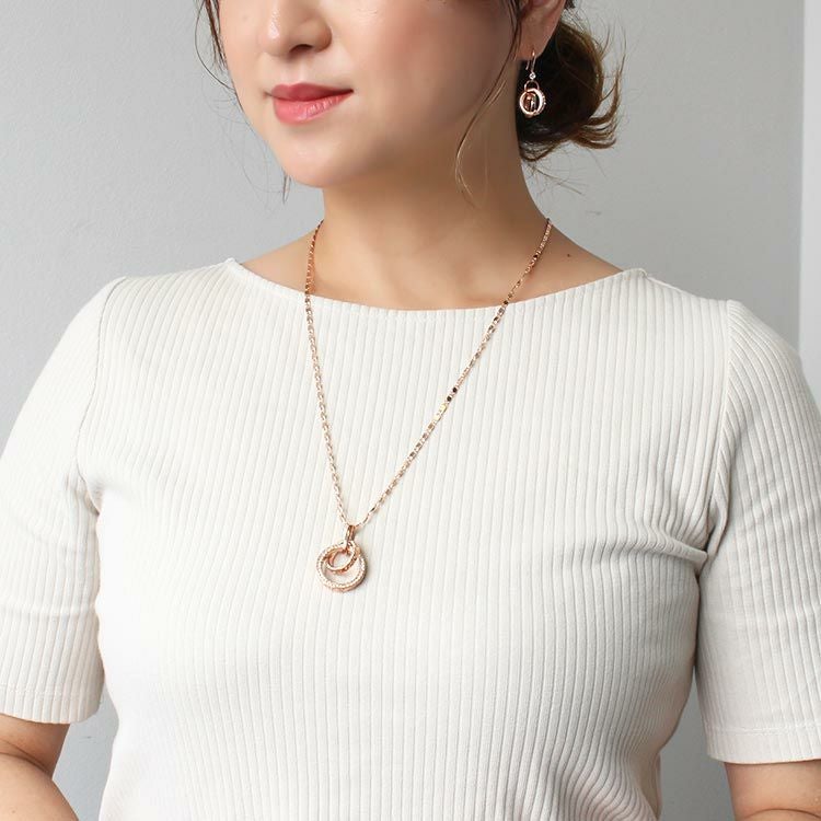 大小2つのサークルモチーフをトップに配したペンダントネックレス。サークルモチーフには幾何学模様のレリーフと、側面には細かなビジューが散りばめられ、揺れるたびにキラキラと煌めきます。ペタルチェーンの細かな輝きが華やかさをプラスしています。