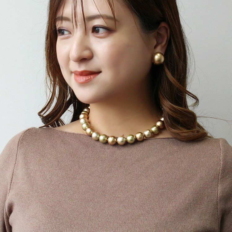綿を圧縮して形成し、その上からパール塗装を施して作られるコットンパールは、繊維による細かい凹凸が特徴で、温かみのある質感を醸し出しています。驚くほどの軽さと、ひとつ一つが真円ではなく、少し歪んだ形状をしていることも、ナチュラルな魅力となっています。