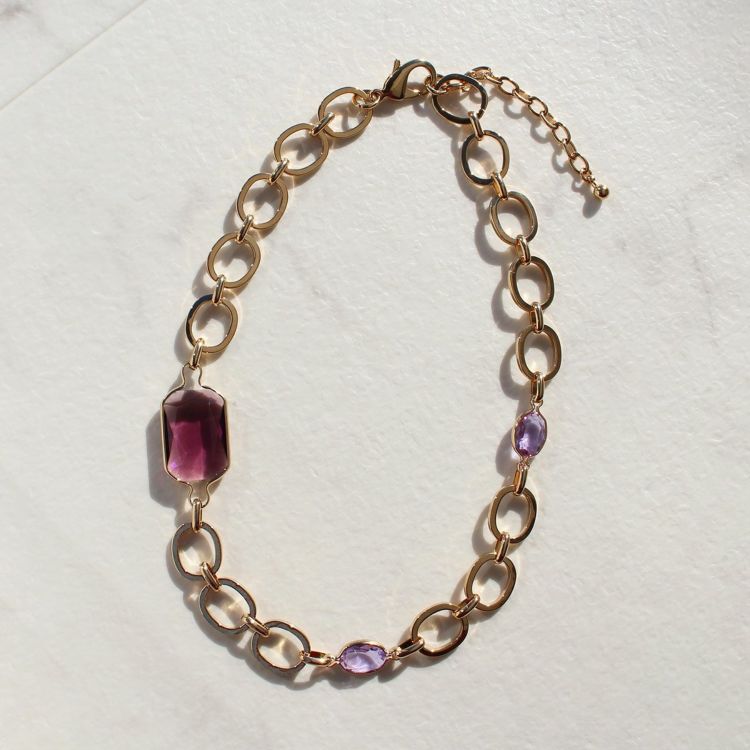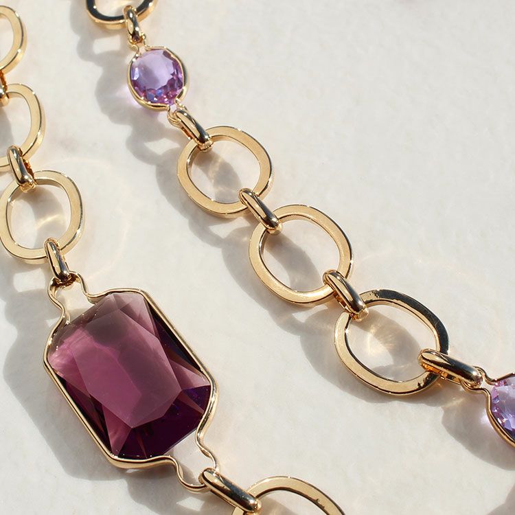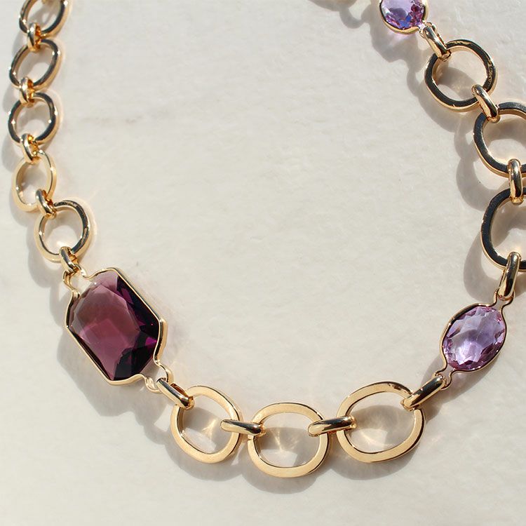 ヨーロッパのチェーンメーカーが生み出す、シンプルながらもこだわりのある金色のチェーンにクリスタルガラスの大粒ビジューが煌めくショートネックレス。光に当たるたびキラキラと反射する美しいカッティングストーンが高揚感を与えてくれます。シンプルな装いに合わせたデイリー使いも、ワンピースに合わせてパーティーやクルーズ、ディナーなどおしゃれしたい日にも。