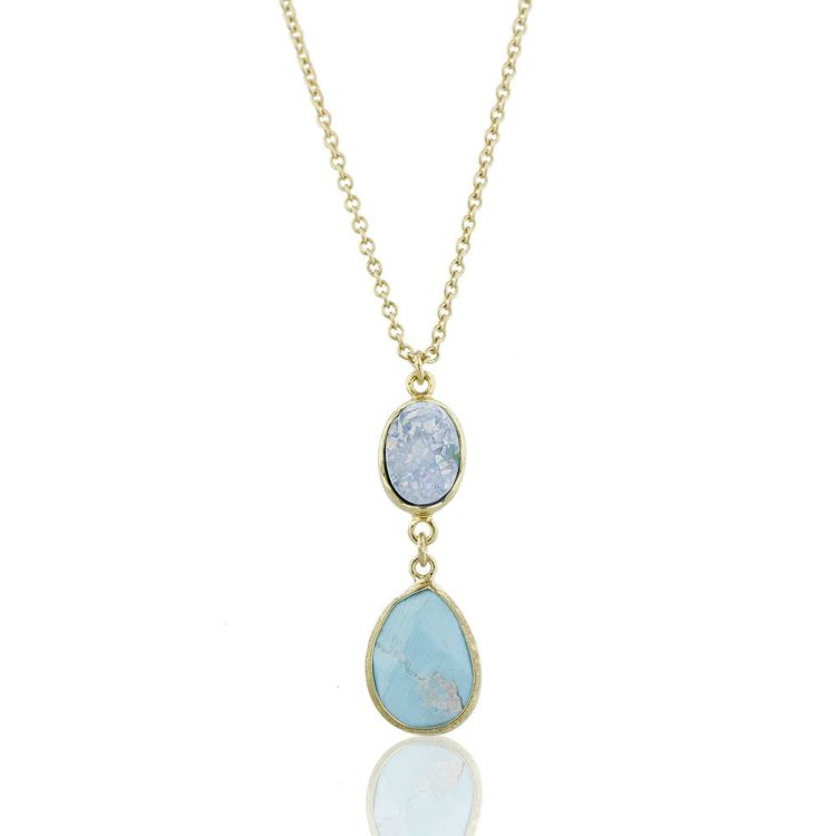 キラキラと輝く様子が魅力的な天然石『ドゥルージー』の下にクォーツをあしらったネックレス。『ドゥルージー』とは、天然石の母岩や結晶の表面を細かい結晶が覆った状態のものを指し、表面がキラキラと輝く様子が魅力的な半貴石。天然の凹凸があり、きらめき方にもそれぞれ個性がある唯一無二の素材として、世界各国で人気を集めています。