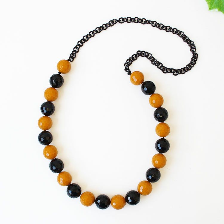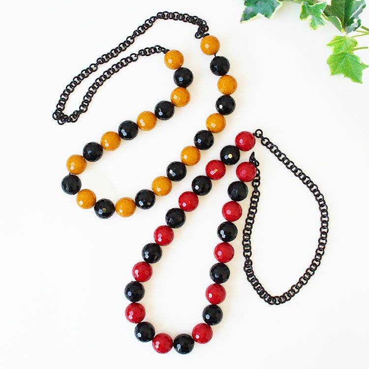 アクリルビーズを組み合わせた存在感ある大ぶりロングネックレス。重さはあるものの、着けた瞬間、重さが気にならなくなるほどしっくりくるオシャレ見えするデザインが魅力です。