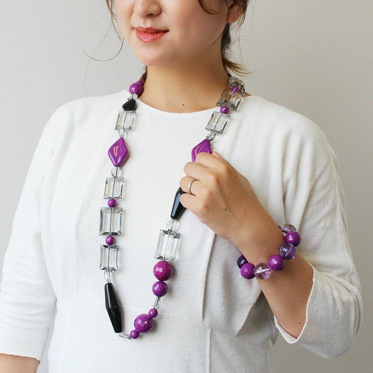 存在感のあるアクリルビーズを組み合わせた大ぶりのロングネックレス。重さはあるものの、着けた瞬間、重さが気にならなくなるほどしっくりくるオシャレ見えするデザインが魅力です。金属を使用していないためアレルギーの方も安心してご利用いただけます。