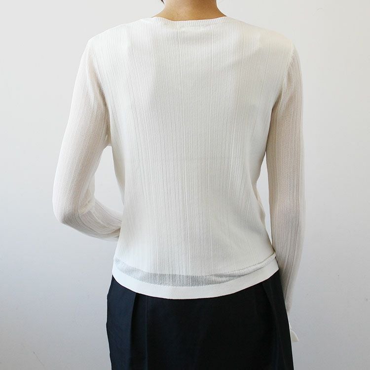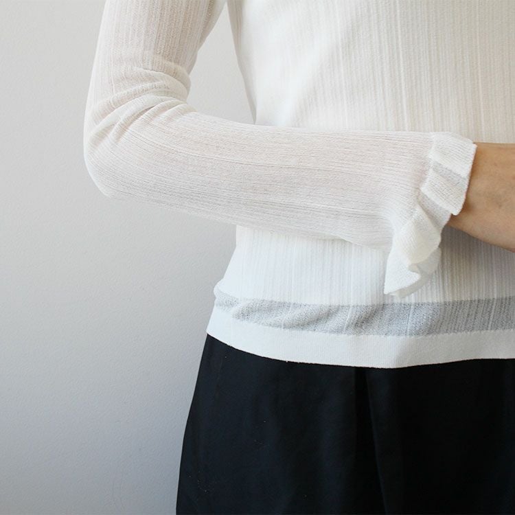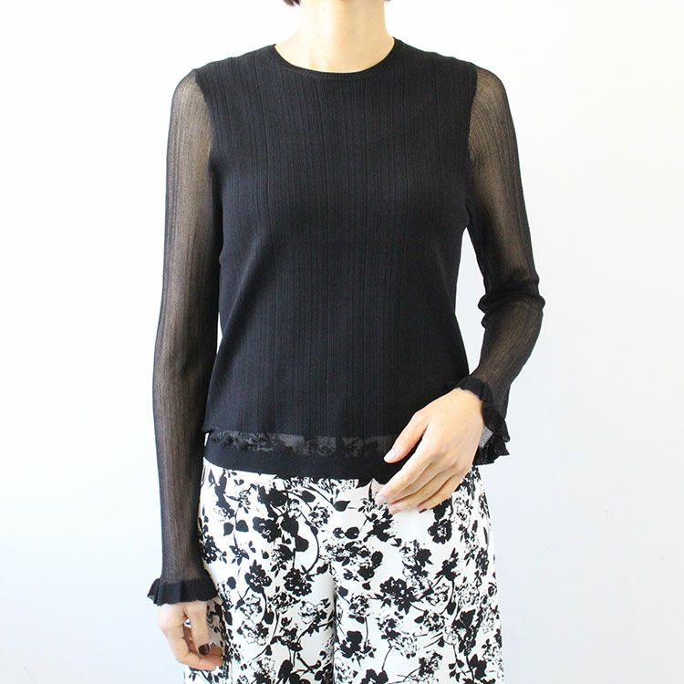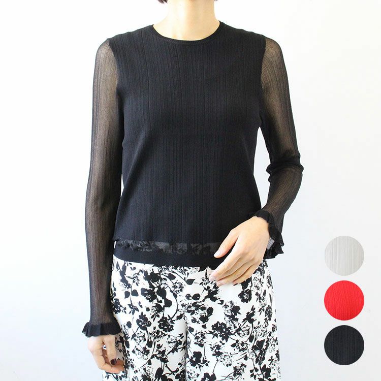 さらっとした着心地のリブニットのカットソー。シアー袖の袖口にはフリルがついていて可愛い大人の1着です。