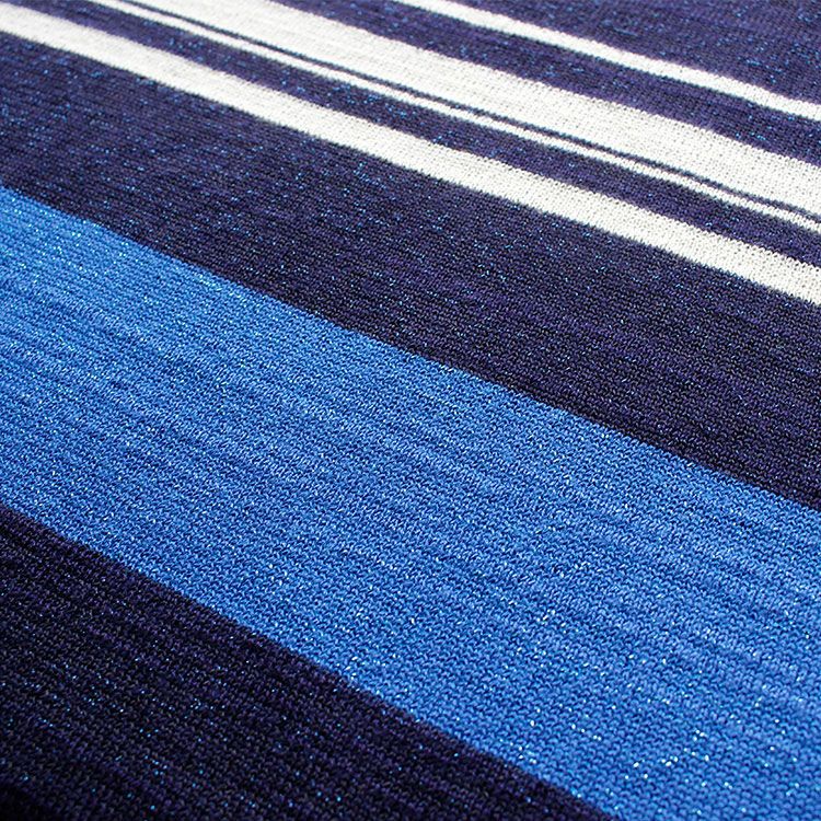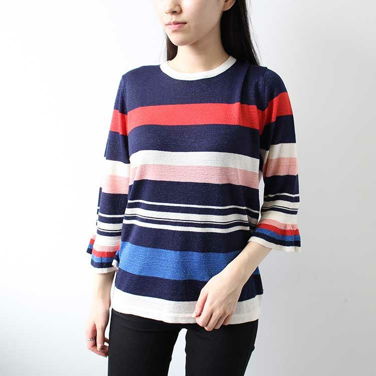 カジュアルなボーダーに広がりのある袖がレディな要素をプラス。濃いカラーの部分にはスリット糸を使用しており、ほんのりとキラキラしています。