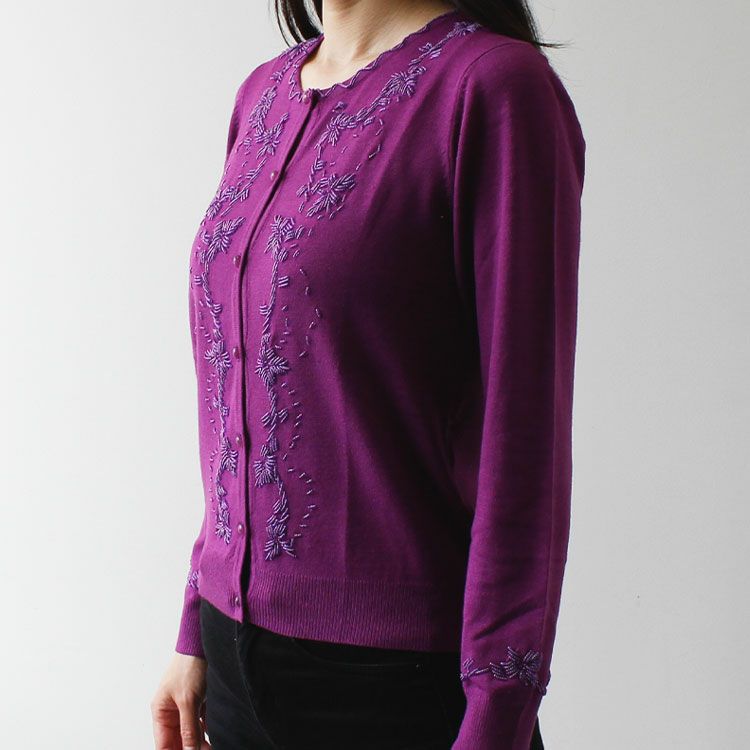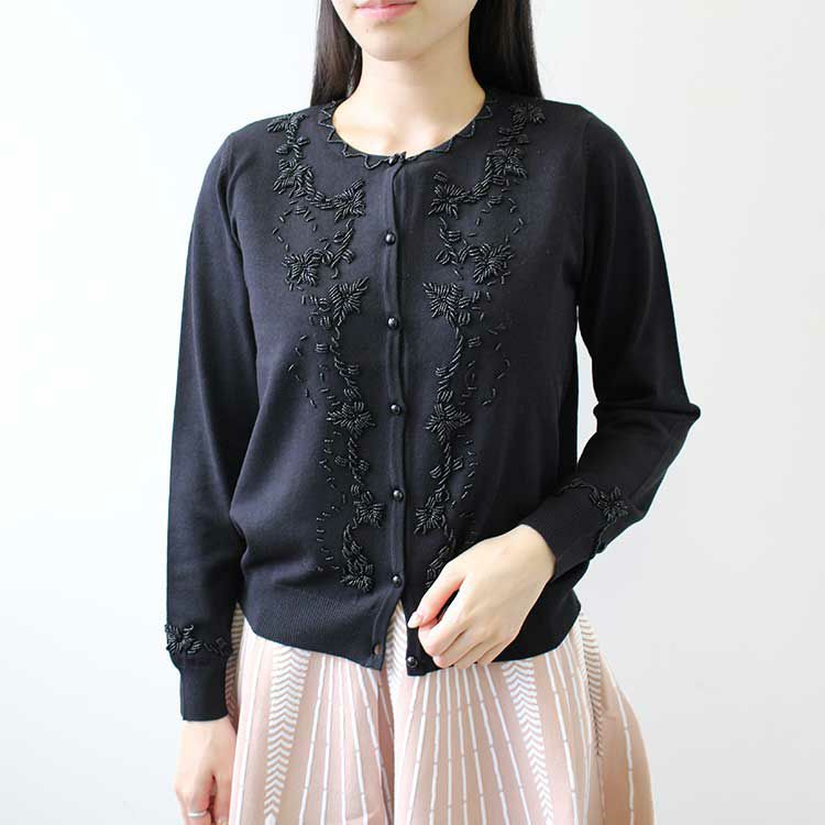 シンプルで使いやすいブラックのカーディガン。襟や前身頃、袖にも施されたビーズ刺繍がさりげなく輝き、華やかさをプラスします。
