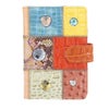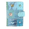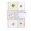 カード入れやペンホルダーもついて、機能性も重視して作られています。 表面にあしらわれたガラスは、単に革の上に接着しているのではなく、革をカットして埋め込んでいるので、引っ掛かりが少ないのもポイント。