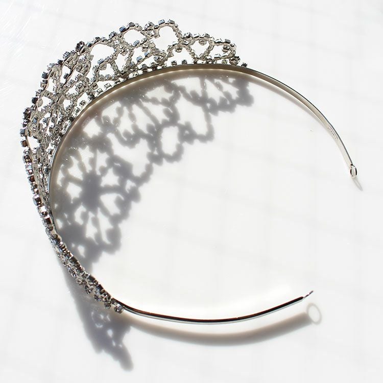 クリスタルガラスがふんだんにあしらわれた王道のプリンセスティアラ。まるでお姫様になったようなプリンセス気分が味わえます。ゴージャスなドレスにも、シンプルなドレスにもピッタリ。たちまち華やかに見せてくれます。正面に高さがあるので丸顔をカバーしてくれる効果も期待できます。柄の部分は若干伸び縮みできる素材を使用しているため多少の幅調整は可能です。