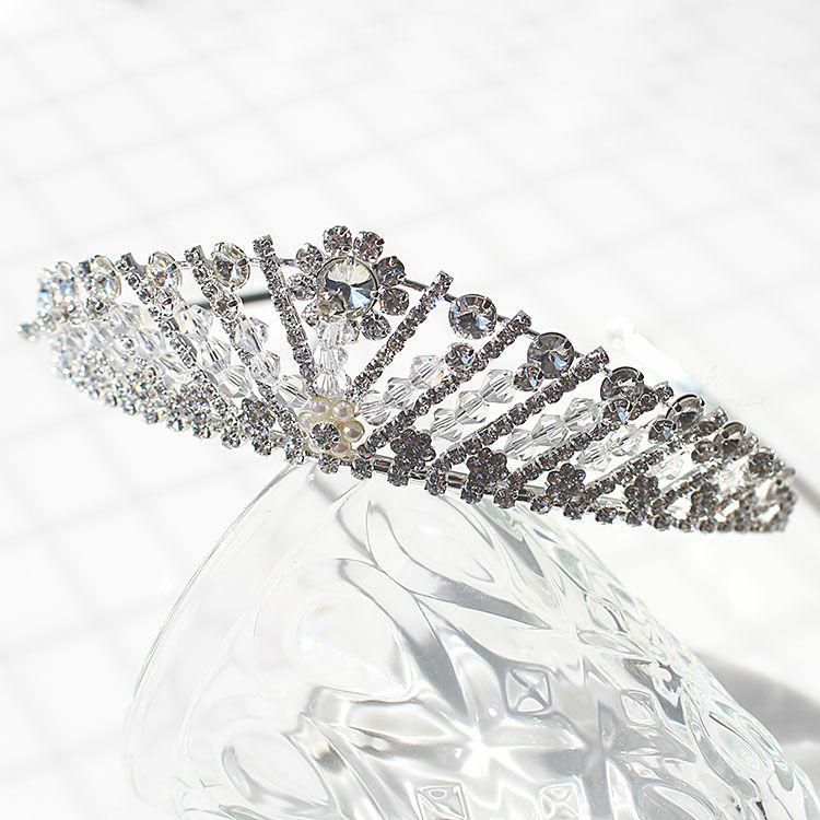 クリスタルガラスがふんだんにあしらわれた王道のブライダルティアラ。まるでお姫様になったようなプリンセス気分が味わえます。ゴージャスなドレスにも、シンプルなドレスにもピッタリ。たちまち華やかに見せてくれます。柄の部分は若干伸び縮みする素材のため多少の幅調整は可能です。
