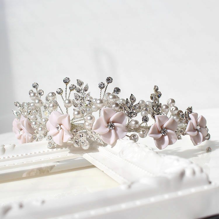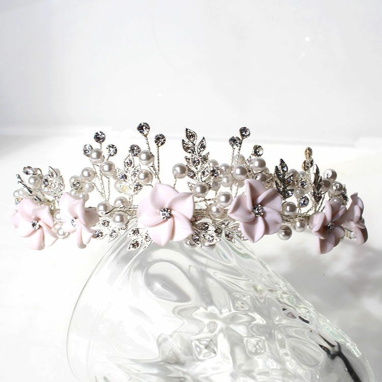 クリスタルガラスのリーフモチーフにパール、ほんのり薄いピンクのフラワーモチーフがキュートなブライダルティアラ。ナチュラルやシンプルなドレスに似合います。お花が横を強調するので面長の方にもおすすめ。柄の部分は若干伸び縮みするので多少の幅調整は可能です。