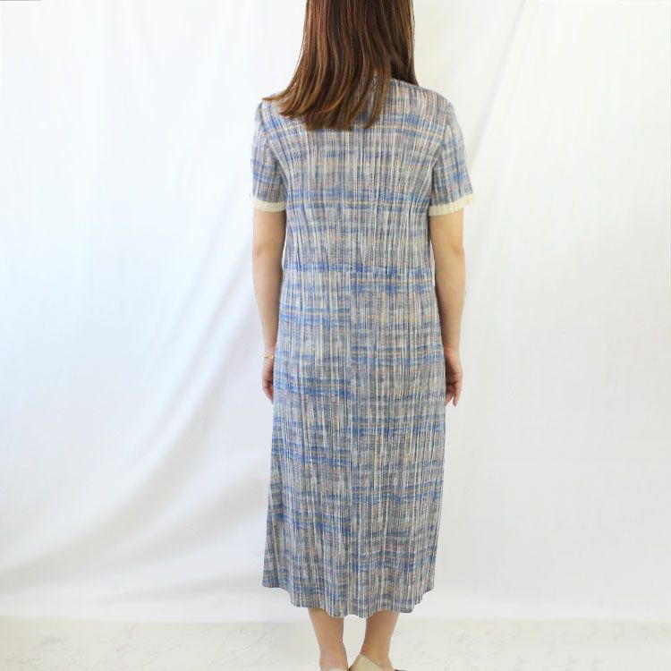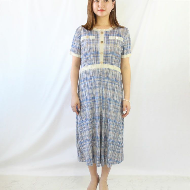 プリーツ素材のロング丈ワンピース。さらりとして伸縮性に富んだ素材で楽な着心地ながら、縦プリーツですっきりとした印象に。金ボタンと切り替えデザインがアクセントになり、これ一枚でおしゃれに仕上がります。