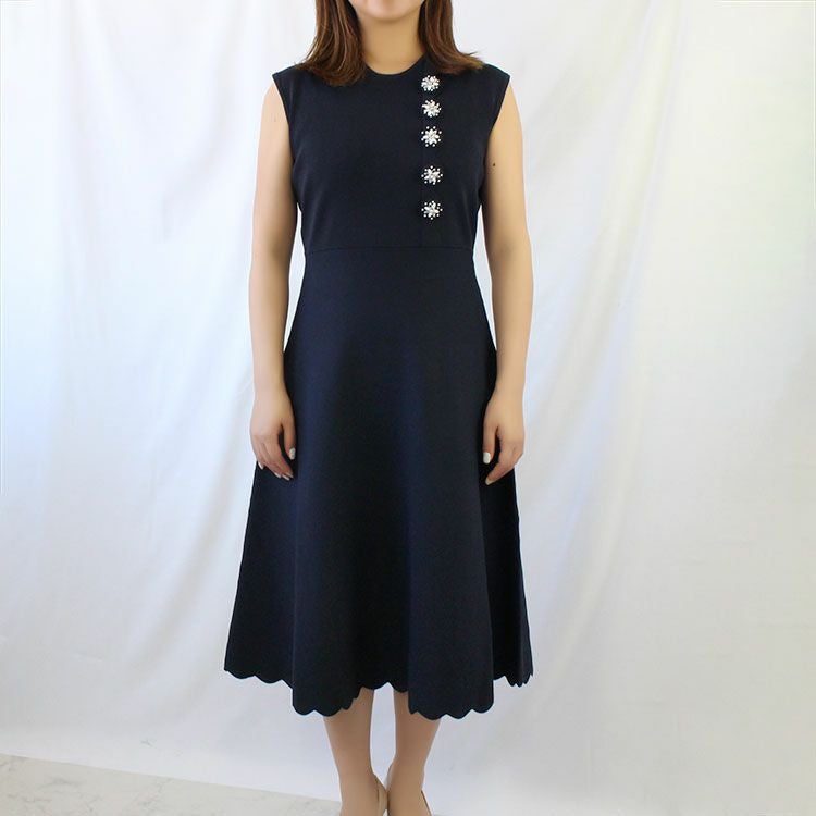 クリスタルガラスやパールなどで装飾されたくるみボタンが、デザインのアクセントに。落ち着いたカラーの品の良いワンピースは、シーンを選ばず活躍します。