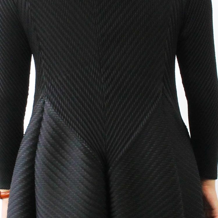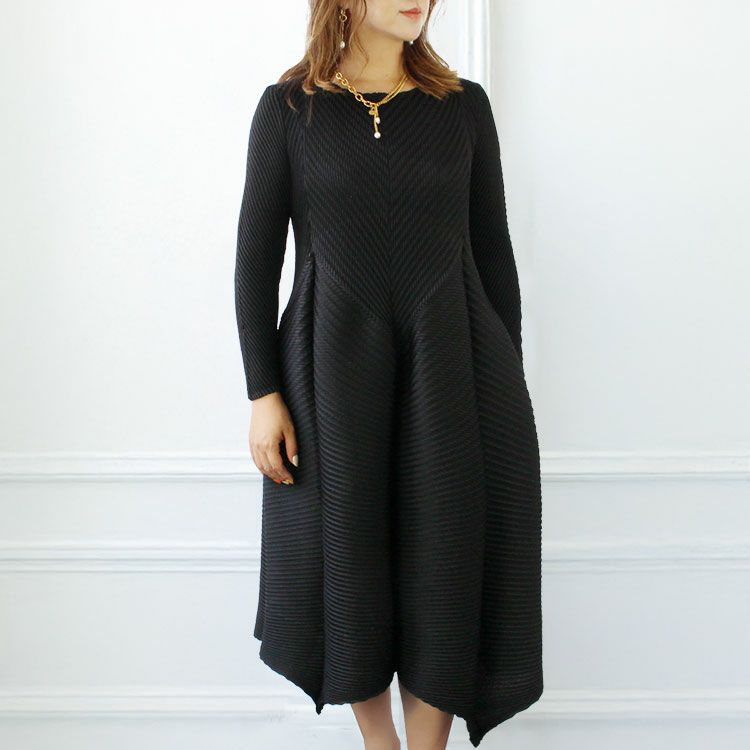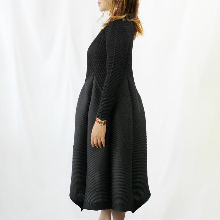 プリーツを斜め使いにし、ウエスト部分をV字に切り替えたスッキリシャープな身頃に、ふんわりと広がるバルーンスカートのシルエットが美しいワンピース。アシンメトリーな裾が、動くたびにふわっと広がり、シンプルで洗練されたモードな雰囲気を醸し出しています。自宅で手洗いが可能で手入れがしやすく、シワになりにくいのも特徴。裏返してくるくる丸めてコンパクトに収納することが可能なので、旅行にもおすすめです。