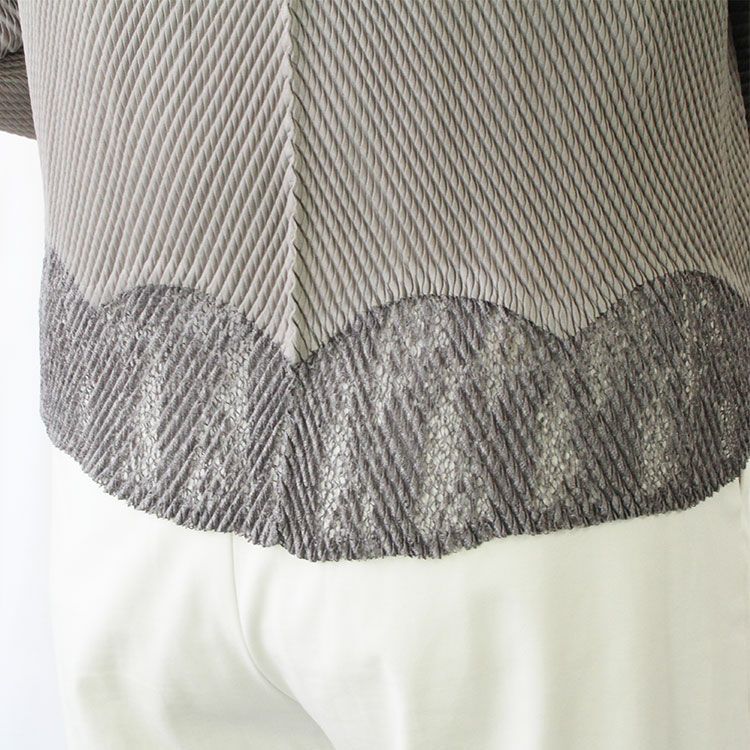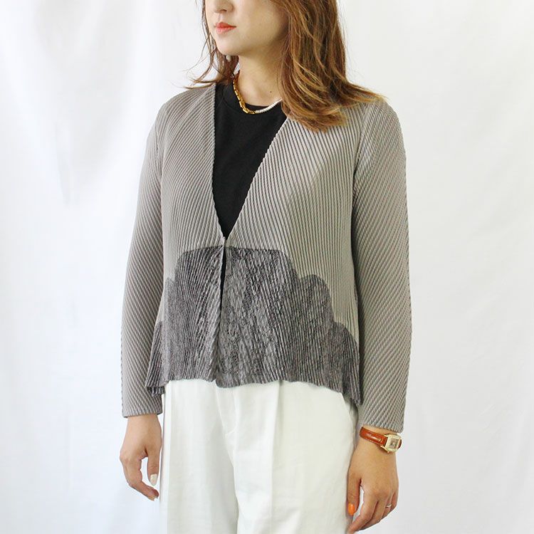 2方向から圧の異なるプリーツをかけた、波打つような表面が特徴的な生地のジャケット。軽く、シワになりにくいのでバッグにポンと入れて持ち運びが可能。旅行はもちろん、季節の変わり目の室温対策にも重宝します。